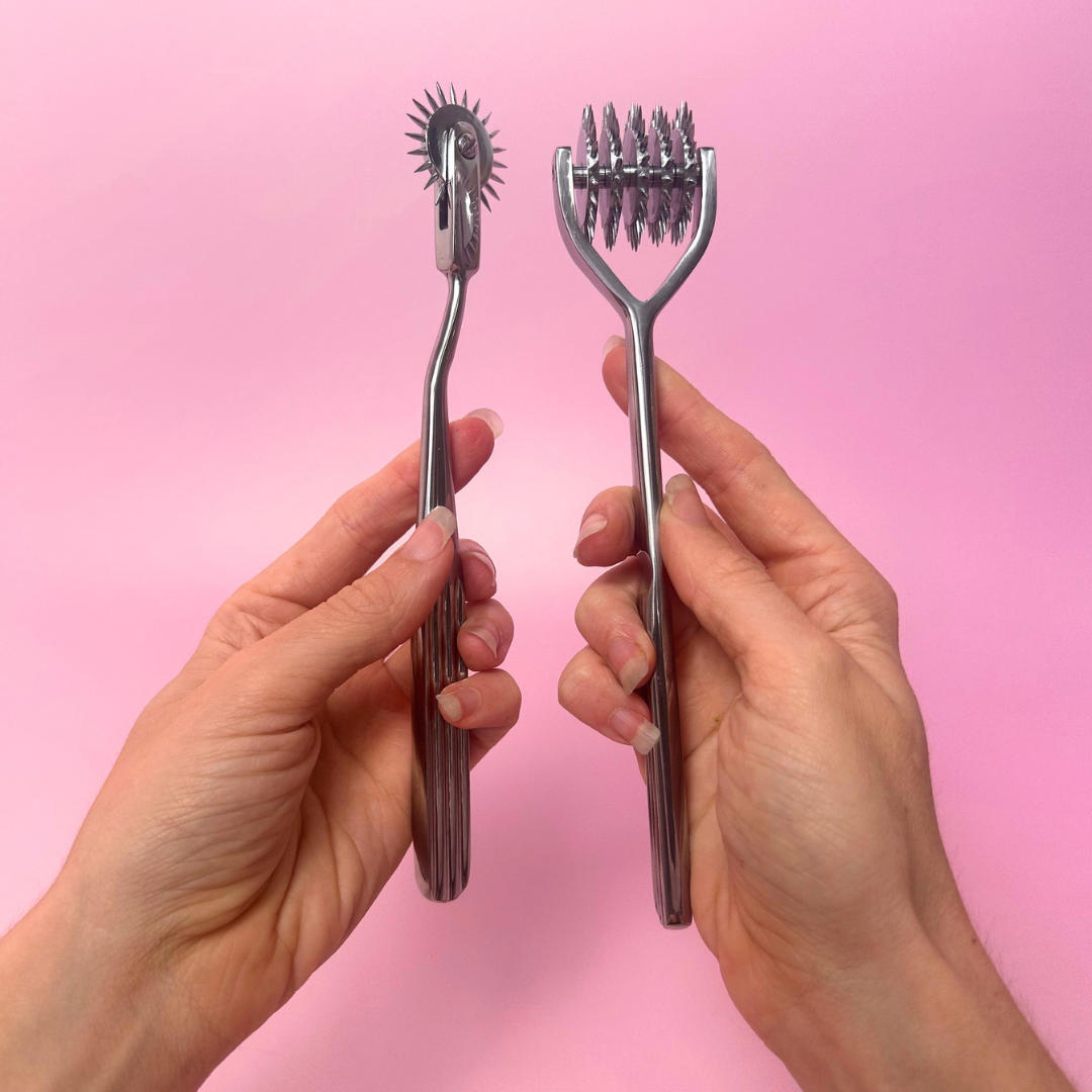A little tease and a lot of sensation; the Kink Kit is your invitation to explore power, sensation and connection. Featuring an impact paddle and a pinwheel, this duo is designed to awaken the body in completely different ways. One brings grounding, rhythmic intensity. The other delivers light, electric anticipation.