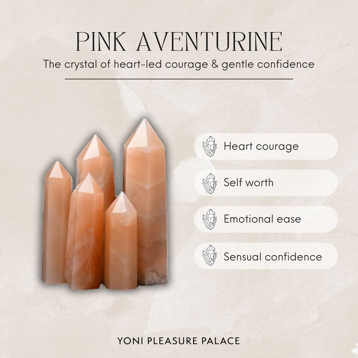 Pink Aventurine encourages us to love boldly and foster the courage to process anxious feelings or depression so we can truly live in receivership of Grace.