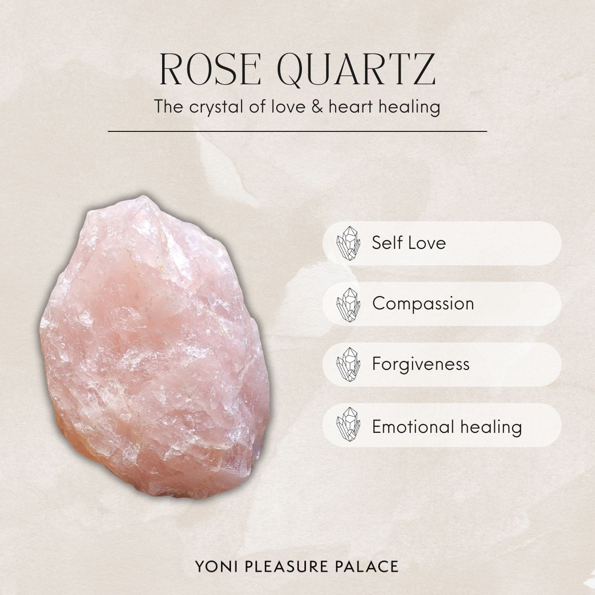 Rose Quartz holds the energy vibration of unconditional love, and coupled up with a yoni egg practice, this combination can create a more loving, intimate connection with yourself and your sexuality.