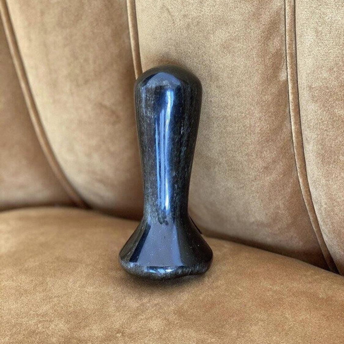 Well, the Grinder is the perfect sensual accompaniment for ”top” folks who like to sit on top of a phallic object and rock their hips back and forth or up and down to reach climax. Since this toy has a flat flared base, it can also be placed atop a chair, bed or on the floor, allowing you to slowly and gently slide down over the sleek, black crystal - letting it fill you up whilst you straddle it. The flared base also makes it compatible for anal stimulation and penetration.