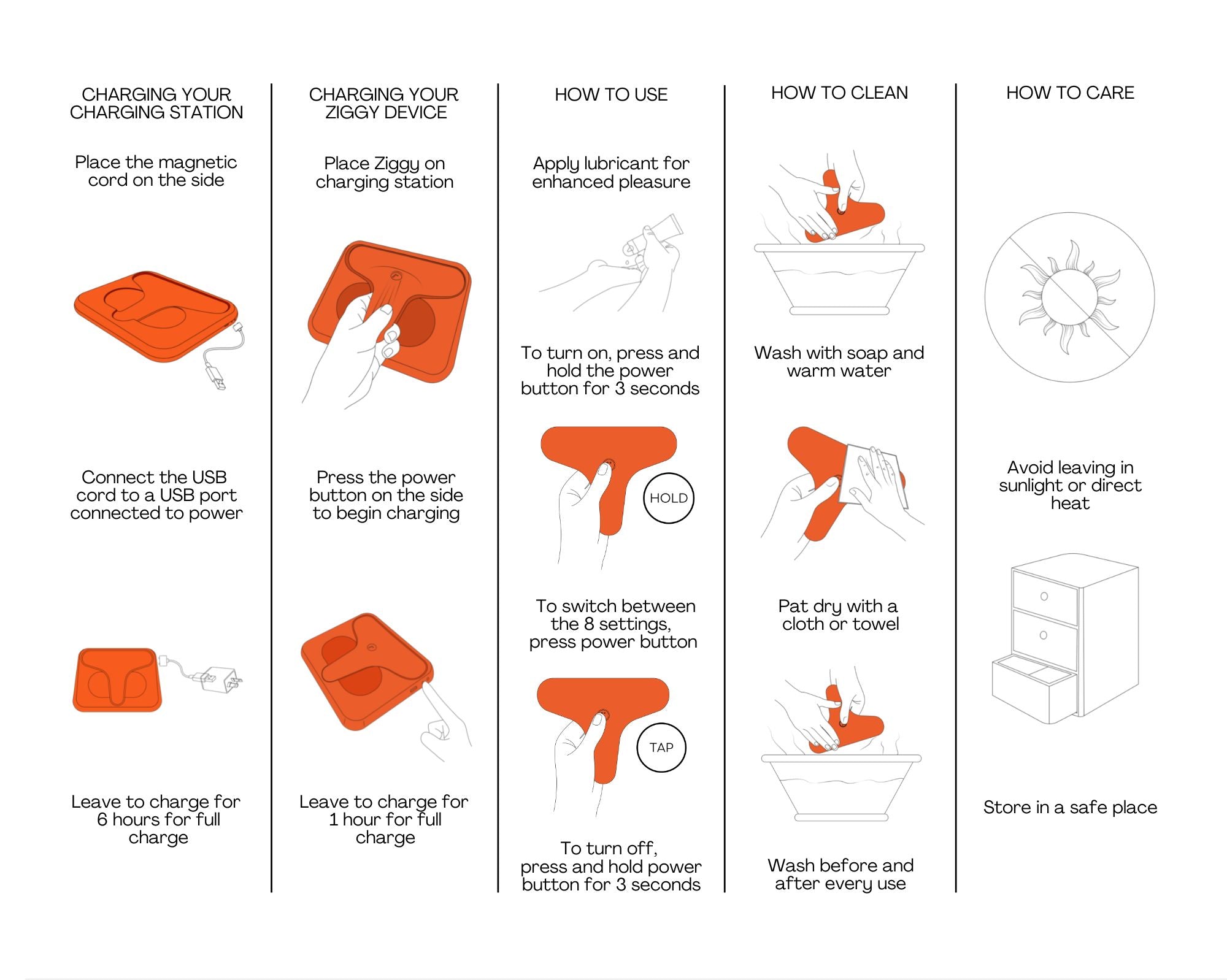 The charging dock is designed to remove the hassle of charging cables which we don't think is very accessible. to charge the ZIGGY, all you need to do is place the product on the magnetic dock and it will start charging and indicate this by flashing an orange light. when the product is fully charged the flashing light will stop. you can also use the charging dock to store your device as it has strong magnets that will hold the device in your drawer, bag or where you choose to take your device.